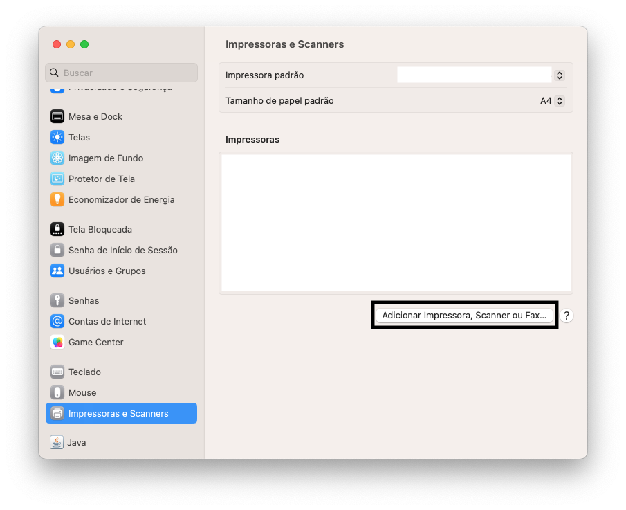 Em seguida, abra as Preferências do Sistema ou Ajustes do Sistema (dependendo da versão do macOS) e selecione "Impressoras e Scanners". Aqui, selecione "Adicionar Impressora, Scanner ou Fax...".